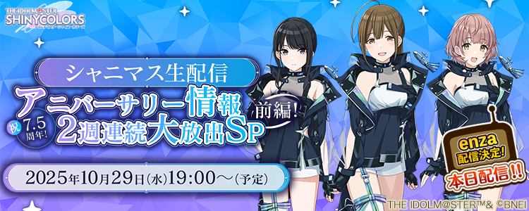 本日「シャニマス生配信~祝7.5周年!アニバーサリー情報2週連続大放出SP 前編!~」enza配信、お見逃しなく!